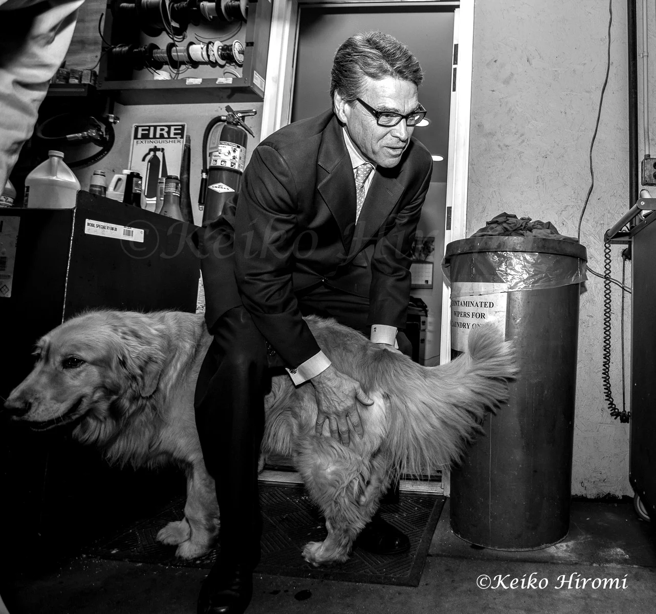 Former Texas Gov. Rick Perry plays with Chester, Golden retriever at Weed Automotive in Concord, N.H on March 12, 2015.